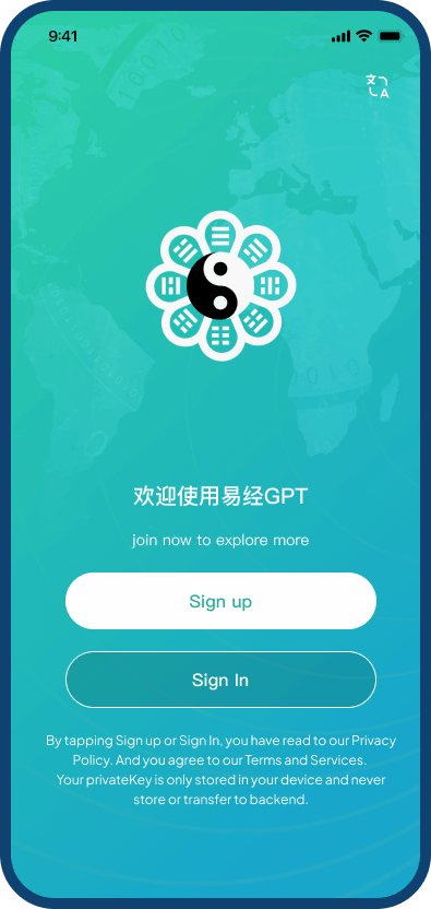易经GPT App uses blockchain based wallet address as accountID to maintain anonymity. For new sign-ups the app generates wallet address and ask users to save privateKey